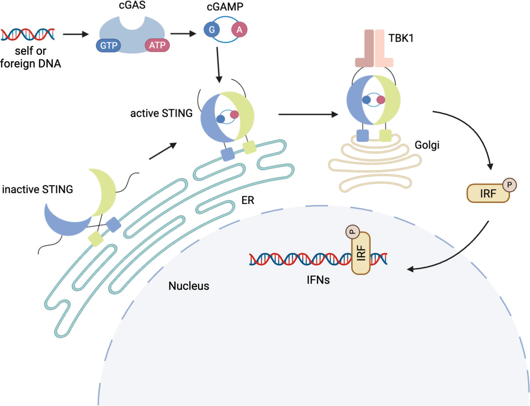 Figure 1. cGAS-STING signaling pathway mediated by cytosolic DNA sensing. Created with Biorender.com.