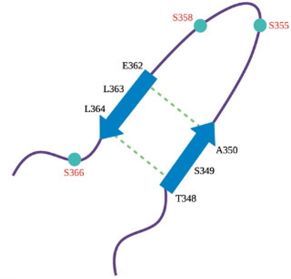 Compared to the inactive structure of STING, a more structurally organized CTT loop domain is seen in the cGAMP-bound structure. Temporary β-sheet formations in the CTT loop, primarily between residues 348-350 and 362-364, are present and assist in maintaining the proper confirmation necessary for the STING protein to function (Al-Masri et al., 2021). The hydrogen bond interactions between L364-T348 and E362-A350 residues observed only in the active structure and among the residues of the temporary β-sheets (Figure 2) promote the overall stability of STING. The conserved serine residues (S355, S358, and S366) located on the CTT structure serve an essential role in STING’s ability to activate the downstream signaling (Tanaka & Chen, 2012; Tsuchiya et al., 2016). Following STING activation, these serine residues are anticipated to undergo phosphorylation by TBK1 (Tanaka & Chen, 2012; Tsuchiya et al., 2016).
