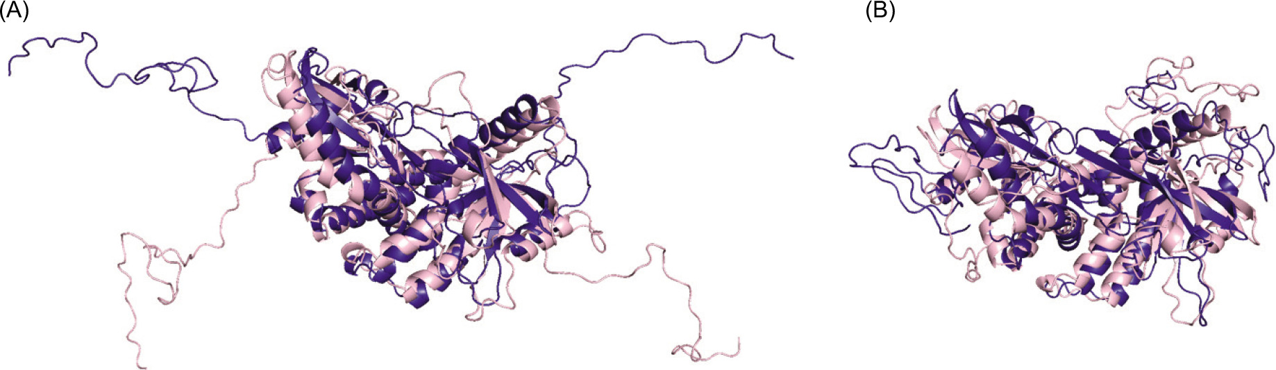 Figure 3. (A) The inactive (pink) and active (indigo) structures at the beginning of the simulations. (B) The CTT loop comes towards the lid when the simulation is at 320 ns.