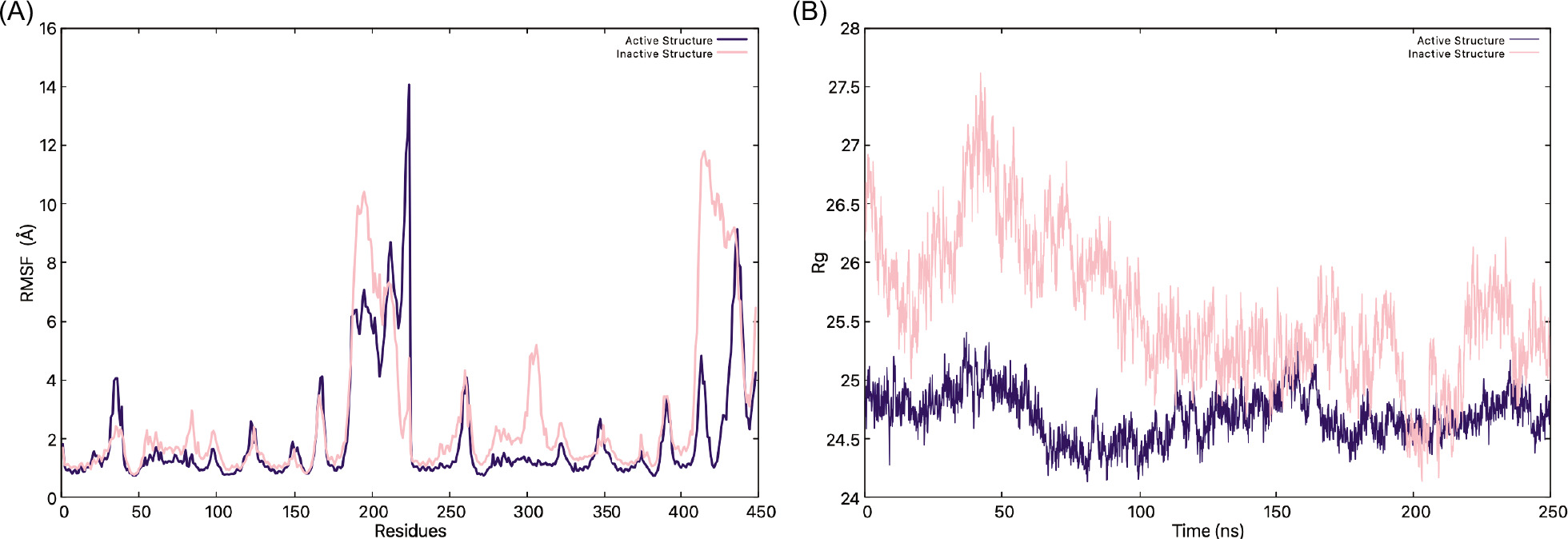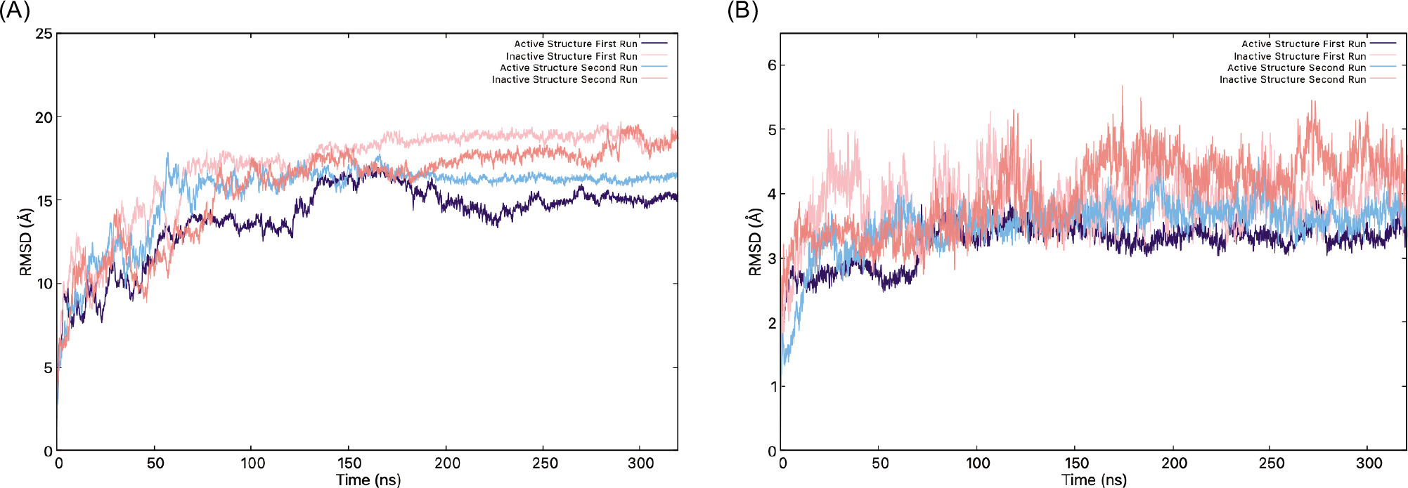 Figure 4. (A) RMSD graphs of the inactive (pink) and active (indigo) structures, (B) RMSD graphs without the CTT.