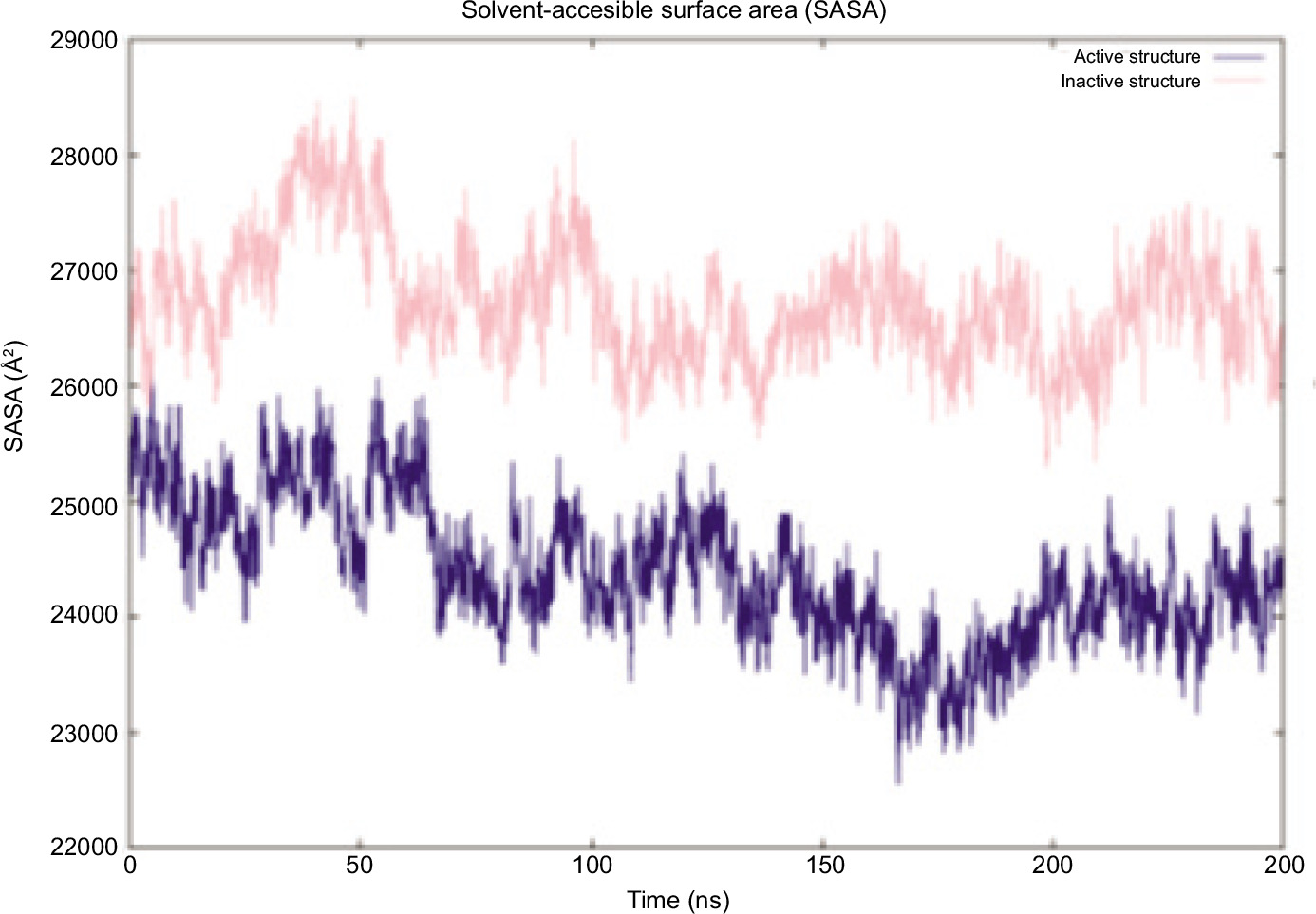 Figure 6. SASA graph of inactive (pink) and active (blue) states.
