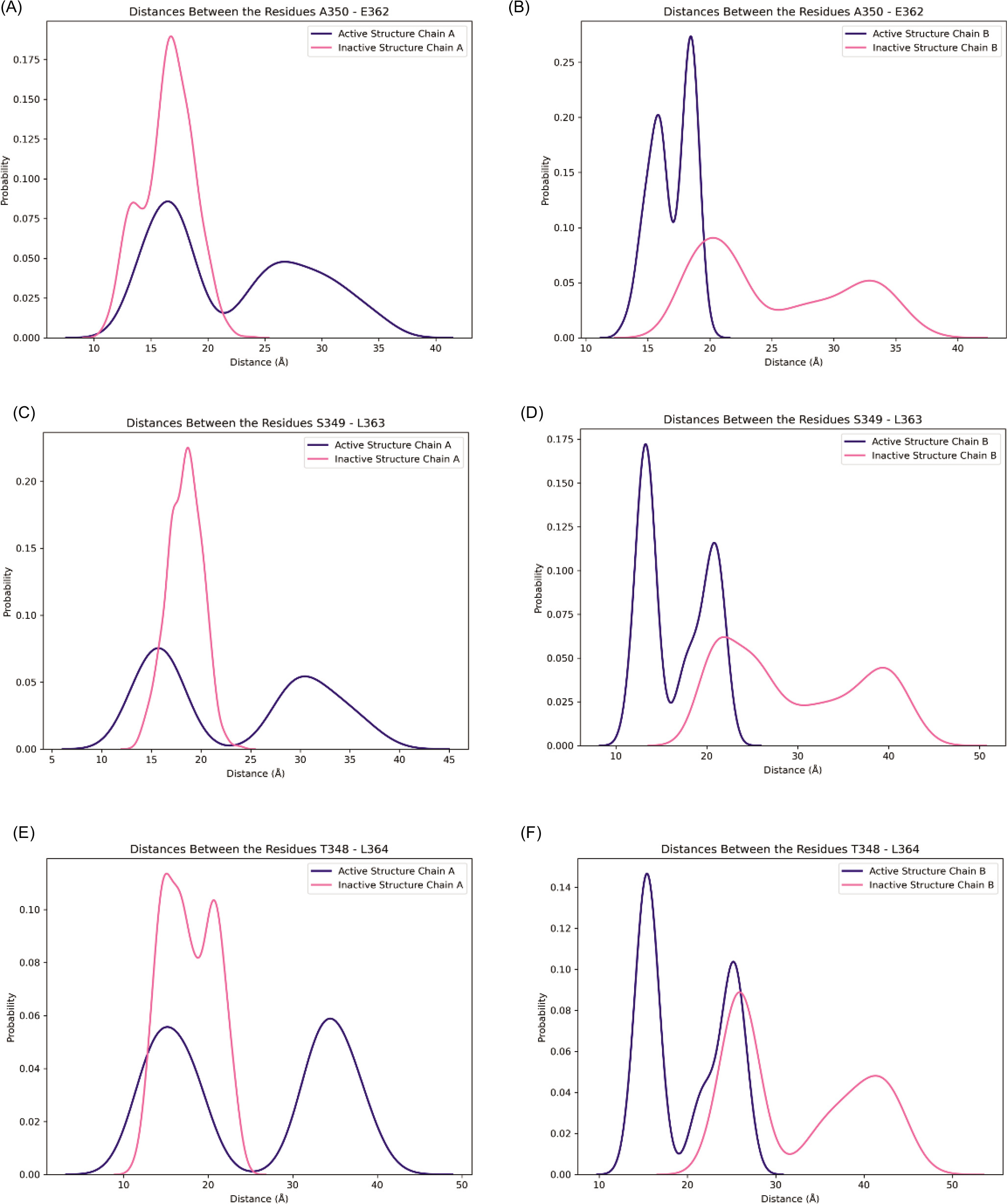 Figure 8. β-sheet forming pairs in the last 50 ns of the first and second run of simulations: Distance distribution of E350-A362, S349- L363, and T348- L364 for chain A (A, C, E) and chain B (B, D, F) are shown in pink for inactive structure and blue for active structure.
