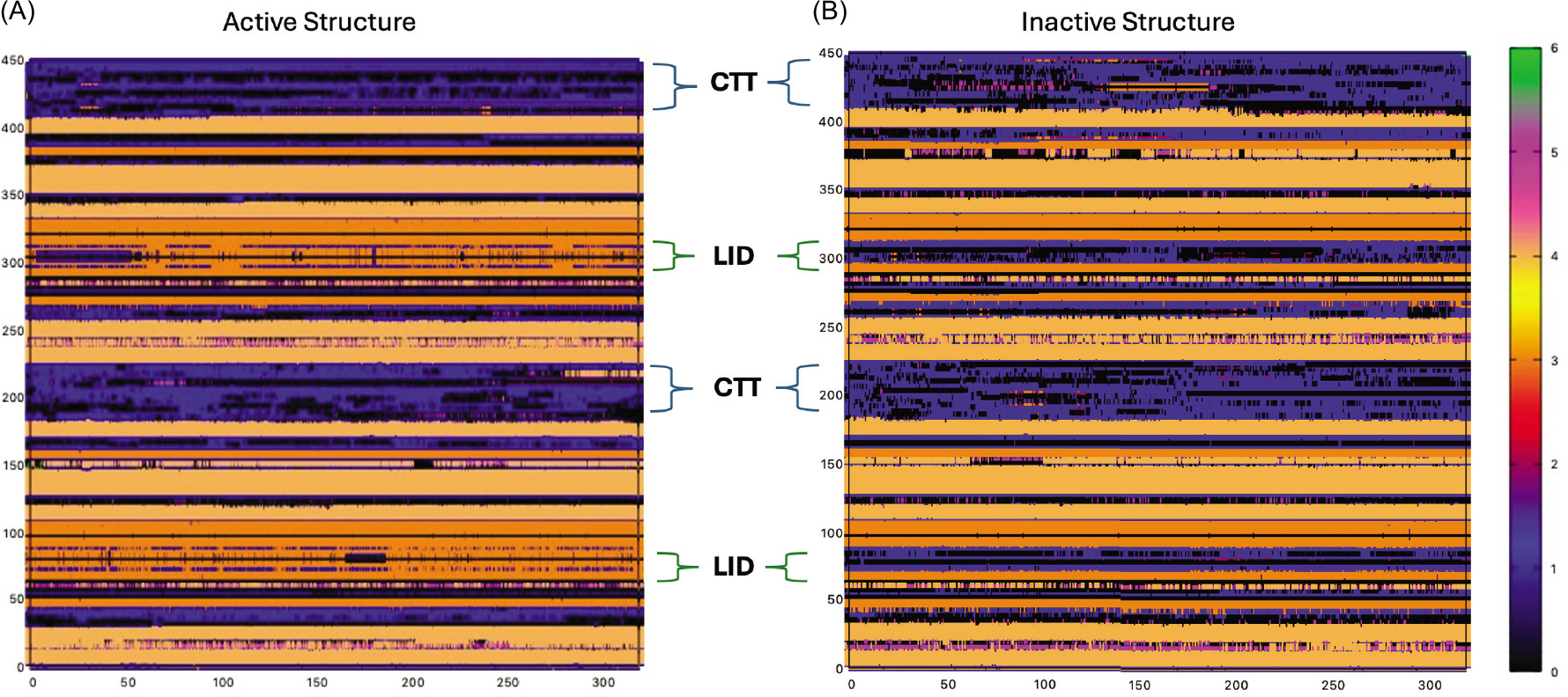In Figure 9, the same type of secondary structure analysis has been carried out (second run analyses can be found in Figure S4). These plots display secondary structure along the different protein domains along the trajectory. The lid of the active structure accounts for the majority of the β-sheet percentage of the protein (Figure 9, please note the color change to orange in the lid domain in the active structure). CTT loops of active and inactive states also show a noticeable difference. While the CTT of chain B in the active state remains as coils, chain A starts to become α-helices. In the inactive state, there are some frames in which the coils become either helices or β-sheets; however, at the end of the simulation, both loops stay as coils.