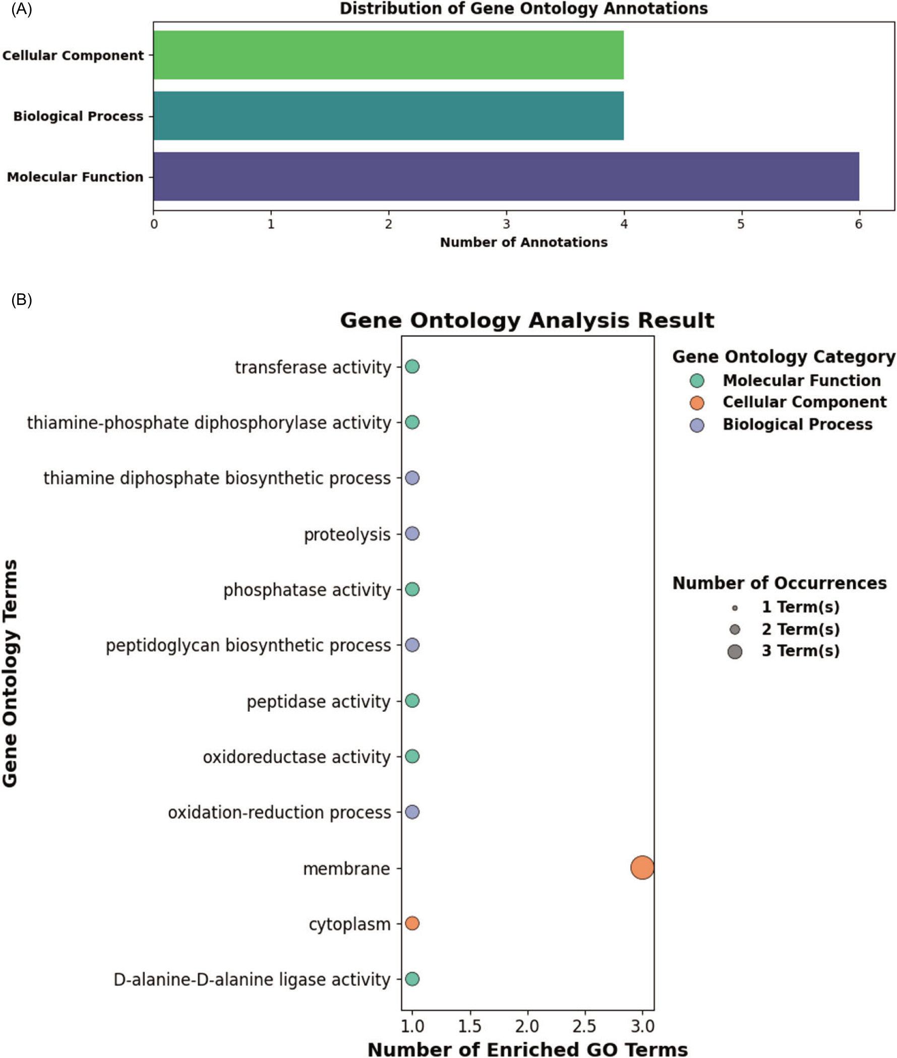 Gene Ontology (GO) terms for the selected HPs were predicted using the Argot2.5 server based on confidence scores (Supplementary File 6). Among the three main GO categories, the majority of terms fell under molecular function, while biological process and cellular component categories had an equal number of classifications (Figure 3a). Within the cellular component category, two distinct GO terms were identified, with three proteins predicted to be membrane-associated. Although membrane proteins can be challenging to study, they are known to play essential roles in bacterial physiology, especially in interactions with environmental stressors (Desvaux et al., 2006; Walian et al., 2012). Under the biological process category, four functions were identified: proteolysis, thiamine diphosphate biosynthesis, oxidation–reduction process, and peptidoglycan biosynthesis. For the molecular function category, six GO terms were observed, including D-alanine–D-alanine ligase activity, transferase activity, and oxidoreductase activity, among others (Figure 3b). These findings further support the functional roles predicted for the HPs.