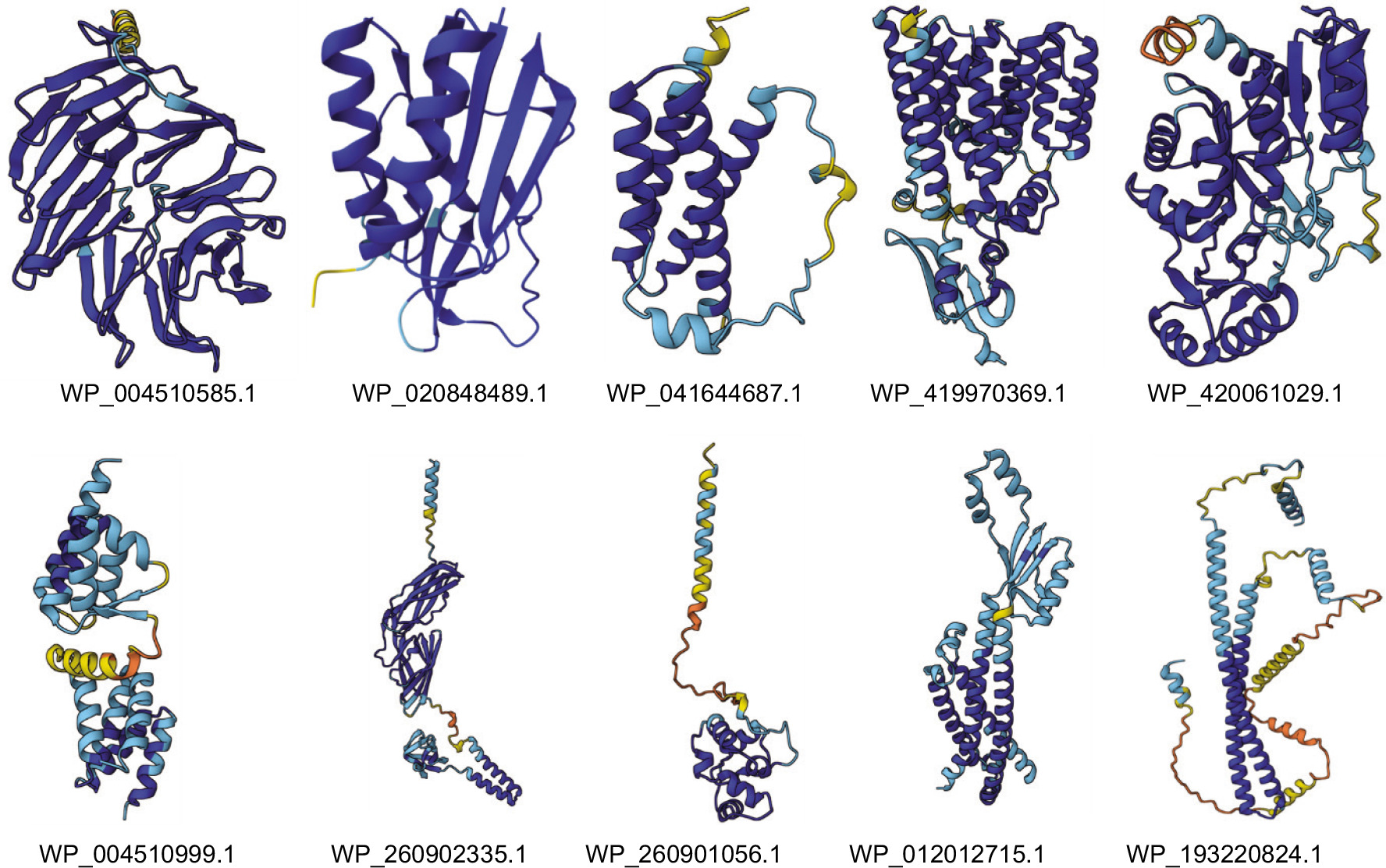 Figure 4. Predicted tertiary structures of all 10 hypothetical proteins. The pLDDT (Predicted Local Distance Difference Test) score, a per-residue confidence metric for predicted protein structures, is represented by a color scale where blue indicates very high confidence (pLDDT > 90), cyan signifies high confidence (90 > pLDDT > 70), yellow-orange denotes low confidence (70 > pLDDT > 50), and orange-red marks very low confidence (pLDDT < 50).